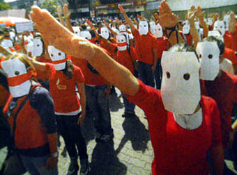 O que mais me espanta nessas notícias de Caracas são as imagens dos estudantes que assumiram a defesa de uma empresa de televisão e protestam contra o governo. Eles podem até ter razão, mas precisavam parecer uma milícia de pitboys parrudos? Ou, pior ainda, como nessa foto de Fernando Vergara/AP, uma coluna perfilada com saudação fascista e máscaras brancas que remetem à Ku Klux Klan?