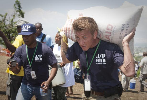 Mas alguma coisa na foto do artigo (acima) me desconcerta. Penn é de esquerda e não faz o jogo das celebridades. Acredito mesmo que ele esteja lá carregando sacos e resolvendo problemas em instância pessoal. Mas a foto é infeliz. Penn sobe a ladeira como um burro de carga, enquanto haitianos ao seu redor levam coisas leves ou não levam nada. Tem até um auxiliar caminhando ao seu lado com um smartphone, possivelmente o celular do próprio Penn. Então é assim: o astro carrega o fardo pesado enquanto um assistente fortão leva seu celular. Pode não ser, mas parece uma cena arrumada para a foto da Getty Images. Sean Penn como o mais empenhado de todos, o herói do real.