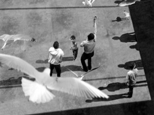 Desse tipo de trabalho, o que mais me impressionou foi um do belga David Claerbout, um explorador de “momentos decisivos” captados por centenas de câmeras simultaneamente. Em The Algiers’ Sections of a Happy Moment, vemos, congelado no tempo, um instante em que um grupo de rapazes e adolescentes se diverte com uma revoada de pombos no terraço de uma casa em Argel. A cena é única, mas os