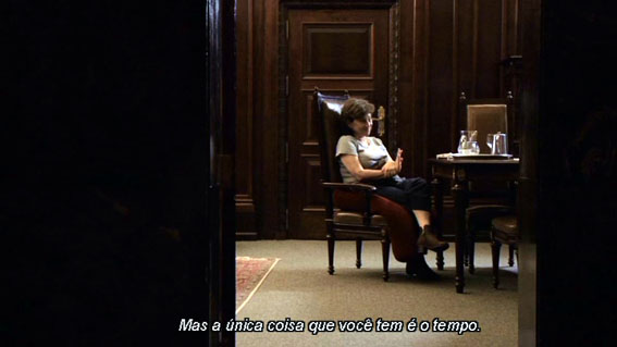 Ela percebe a segunda câmera ao chegar à sala, e isso instala uma certa tensão em toda a cena. Esse plano lateral deixa à vista uma série de circunstâncias particulares, a começar pela formalidade da sala e uma certa solenidade com que tudo foi preparado. Percebemos melhor o desconforto de Chantal numa cadeira sobre a qual é improvisada um almofada para deixá-la mais alta e os pés quase não conseguem encostar no chão. Ficam mais expostas as suas reações diante das perguntas de Leonardo, a sua linguagem corporal no trato com os assuntos da entrevista, seu esforço para encher sucessivos copos de água, o ato de desobediência quando lhe pedem que não fume no recinto. Por tudo isso, o termo “um vídeo de entrevista” ganha um sentido mais, digamos, dramático do que sugeria inicialmente.