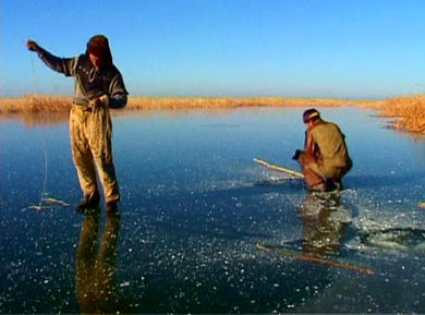Em seguida veio Fishing in an Invisible Sea (foto à direita), rodado entre pescadores nos 20% que sobraram do Mar de Aral (na verdade um grande lago), no Caracalpaquistão (ex-URSS). Ali os moradores remanescentes esperam o mar e os peixes “voltarem” num mítico ciclo de 40 ou 50 anos após a desertificação quase total. Dos três, este é o único filme que possui alguma narração, repartida entre os representantes das três gerações enfocadas. E também o único que contém uma sequência de diálogo efetivo entre personagens.