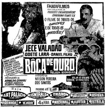 De resto, as luzes do sucesso podiam se acender quando algumas circunstâncias se somavam: o apelo erótico, um elenco atraente, uma base literária consagrada. Boca de ouro, de Nelson Pereira dos Santos, tinha Jece Valadão e Nelson Rodrigues como chamarizes, razão pela qual fez muito mais público que Vidas secas, obra-prima tipicamente cinemanovista. Os cafajestes (Ruy Guerra, 1962), com seu amoralismo e os famosos nus frontais de Norma Bengell, travou uma batalha contra a censura e foi liberado com a inédita proibição para menores de 21 anos. Os ‘cacifes” transbordaram enquanto os colegas do diretor faziam questão de demarcar sua distância em relação ao “europeísmo” do filme.