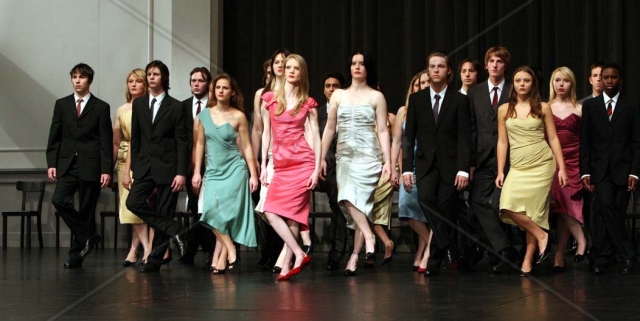 – A coreografia dos homens e mulheres perfilados frente a frente no salão é da obra Kontakthof. No filme, alternam-se adolescentes, adultos e pessoas idosas fazendo o mesmo número. Os adolescentes, que aparecem mais rapidamente (foto acima), eram amadores que toparam o desafio de aprender o método de Pina, muitos sem jamais terem ouvido sequer falar dela. Esse processo está no doc Sonhos de Dança – Nos Passos de Pina Bausch (Tanzträume), de Anne Linsel e Rainer Hoffmann (2010). Saiu em Portugal num DVD duplo com o Pina do Wenders. Um ótimo complemento, por sinal, já que mostra a árdua construção desse misto de dramaticidade e ludicidade, controle dos músculos e entrega radical que a gente vê no palco. E Pina aparece avaliando os alunos, reagindo às provas, etc. Ela era mesmo uma figura quase mítica, que despertava fascínio e medo nos jovens aspirantes, mas também era capaz de fazê-los descobrir o próprio corpo e perder a timidez.