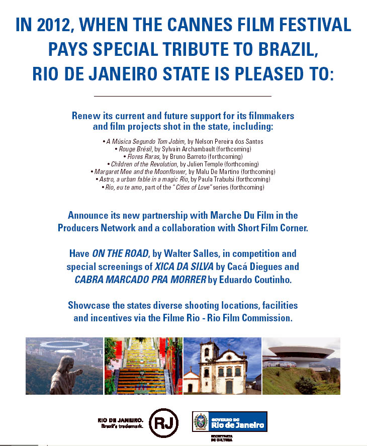 Começa hoje o Festival de Cannes. Aqui está, em primeira mão, o anúncio que o Governo do Estado do Rio vai publicar nas edições especiais das revistas Variety, Film France, Screen e Hollywood Reporter. Logo abaixo, veja a agenda oficial da homenagem de Cannes ao Brasil e das atividades de promoção da Secretaria de Estado da Cultura do RJ.