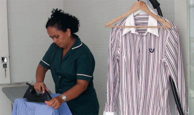 O simples fato de transferir para os jovens a seleção de momentos, o grau de proximidade e o tipo de relação entre quem filma e quem é filmado já garante um ponto de vista diferenciado. Mais que isso, gera uma tensão muito típica dos contatos entre patrão e empregado no âmbito doméstico. A pouca idade dos filmadores ameniza um bocado essa tensão, mas ela está lá, explicita ou implicitamente, naqueles atos de flagrar, expor, conversar. A diversidade de posturas dos empregados, as relações de cada um com o espaço físico da casa, a maneira como cada qual reage ao fato de se tornar estrela do filme, tudo isso diverte e constrange ao mesmo tempo.