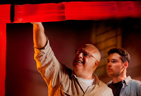 Na peça Vermelho, de John Logan, assistimos ao embate entre duas gerações e duas concepões sobre o lugar da arte no mundo. A ação se passa em 1958. Em seu ateliê nova-iorquino, Rothko, aos 53 anos, trava uma pequena batalha com seu jovem assistente, Ken (Bruno Fagundes). A primeira metade da peça é a afirmação, por Rothko, da pintura como coisa solene, que merece o tempo do pintor e do espectador. A arte, segundo ele, não é para ser bonita nem agradável, mas para tirar as pessoas do chão e fazê-las pensar. Justifica os murais que está fazendo para o restaurante Four Seasons com a intenção de “tirar o apetite” da alta burguesia que o frequentará. Da sua poltrona, Concórdia assente com a cabeça fervorosamente. Ela está com Rothko e não abre.