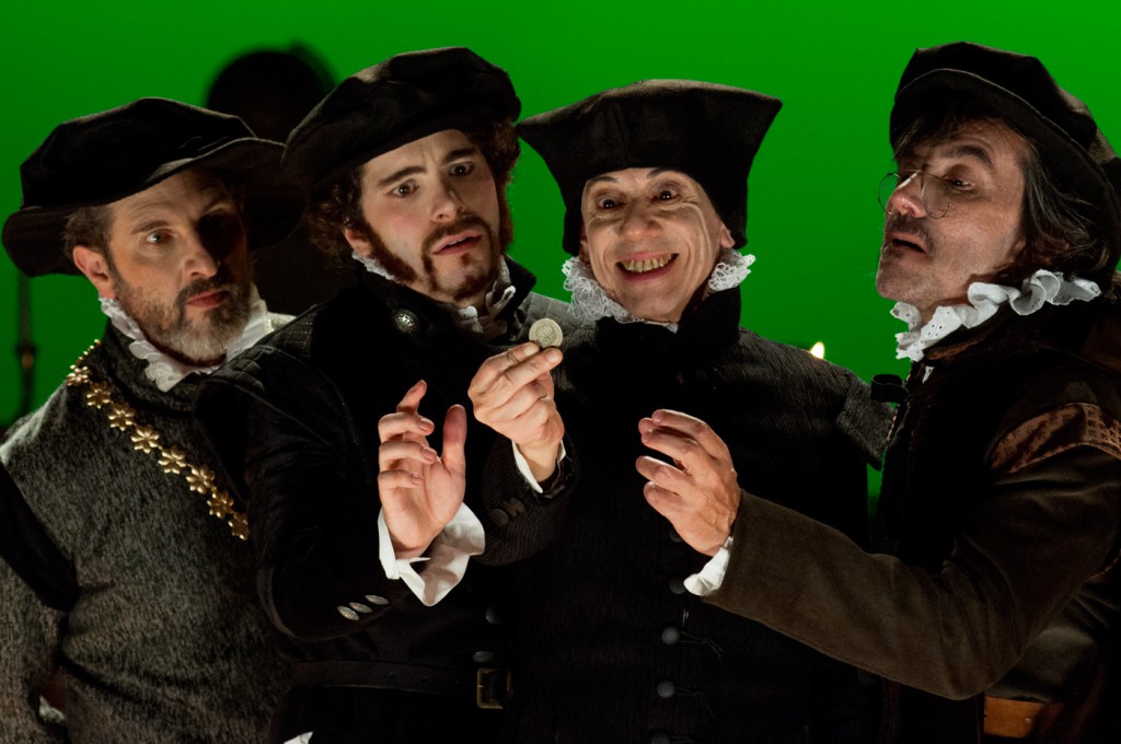 O filme articula esses depoimentos com cenas de uma peça montada especialmente para isso no belíssimo Theatro São Pedro de Porto Alegre. The Staple of News, de Ben Jonson, foi escrita em 1625 como uma sátira ao crescimento dos negócios jornalísticos e ao capitalismo britânico nascente. Na trama, Pila Jr., um jovem milionário dissipador, associa-se a uma agência de notícias cujos personagens se chamam Tagarela, Expectativa, Censura, e por aí afora. Tanto Pila Jr. quanto o dono da agência aspiram à mão de Pecunia, uma riquíssima herdeira.
