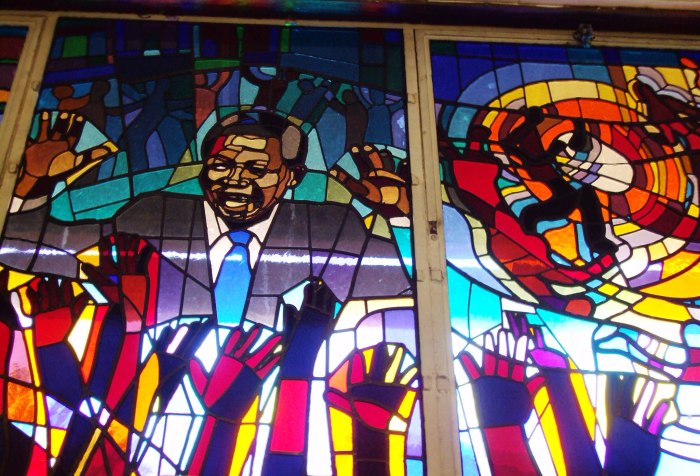 Mesmo antes de morrer, Nelson Mandela já era cultuado como um misto de herói e santo nacional na África do Sul. O carinho do povo se manifestava de todas as maneiras e em todos os locais imagináveis. Em Joanesburgo, no bairro de Soweto, o maior centro de resistência contra o apartheid, a igreja católica de Regina Mundi serviu de ponto de encontro e refúgio dos negros perseguidos pela polícia. Ela foi duramente atacada durante o famoso levante de 1976 e ainda mostra sinais de balas nas paredes internas e externas. Mas o que salta aos olhos são os vitrais hiper-coloridos, onde, em meio a anjos e santos, figuram cenas das lutas e marchas do povo de Soweto, coroadas por uma aclamação a Mandela. Ali a mescla entre sagrado e secular se apresentava em todo o seu esplendor.