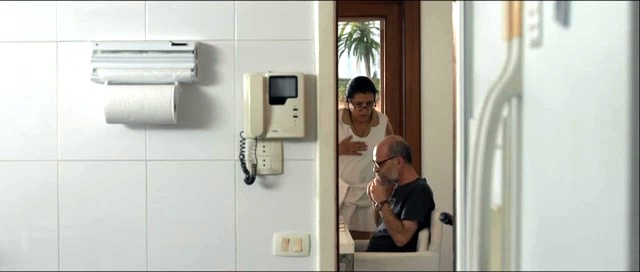 O olhar da cozinha: são poucos os momentos em que Val ou Jéssica não estão envolvidas diretamente na ação. Não se trata apenas de mudar o foco principal dos patrões (como em Casa Grande) para os empregados. O que se constrói aqui é uma perspectiva que vem da cozinha e das dependências de serviço. Uma sequência é particularmente demonstrativa desse ponto de vista. “Seu” Carlos convida Jéssica a almoçar com ele na sala de jantar. Val os serve, mas a câmera insiste numa tomada de dentro da cozinha, acompanhando as várias saídas e retornos de uma constrangida Val e as reações silenciosas da faxineira escandalizada. O recurso, além do efeito cômico, situa o espectador na mentalidade das empregadas.