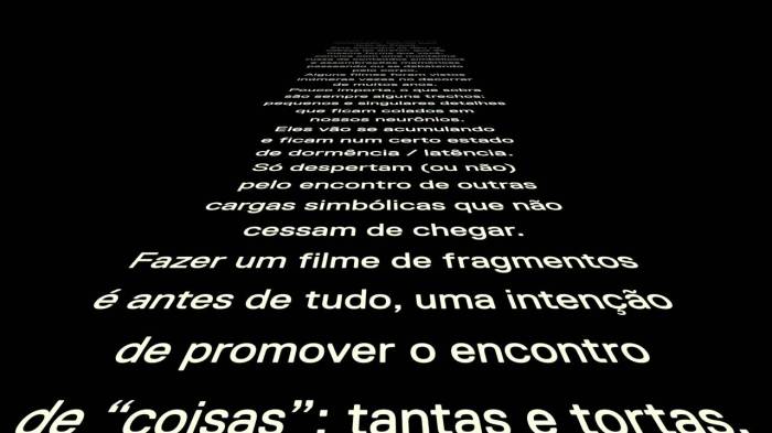 No cinema brasileiro, além dos mencionados aqui, vários outros filmes se enquadram ou se aproximam o suficiente para serem assimilados pela categoria de ensaios. Alguns deles não cabem nas modalidades levantadas por Corrigan. Cito, apenas por citar, os curtas O Som ou Tratado de Harmonia e Música Barroca Mineira, de Arthur Omar, ensaios exploratórios de imensa liberdade e alcance. O primeiro pode ser visto como um pequeno tratado sobre a voz, esse elemento tão importante na elaboração do filme-ensaio, e sobre um certo “desejo de som” que ajudaria a constituir a identidade das pessoas. O segundo, como um ensaio de contaminação da linguagem pelo tema (acúmulo, repetições, descontinuidades, volutas, asceses e esplendores do barroco).