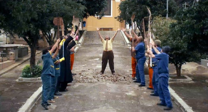 Já desde o título, o filme de Juliana se propõe como paródia (das Sinfonias da Metrópole). Se a história começa num clima de filme dos Trapalhões, logo o irrompimento do primeiro samba entre os coveiros vai abrir o cortejo de uma sátira ao universo funerário, empreendimento tanto ingênuo quanto engenhoso. Um musical passado entre túmulos e caixões, uma espécie de Jacques Demy dos umbrais. E é assim que a comédia vai se firmando cena após cena, entre o tosco e o absurdo, entre a canastrice e a ideia brilhante. No centro de tudo, o quase-romance entre um aprendiz de coveiro que não consegue “vestir a camisa” do seu ofício e uma aplicada especialista em verticalização de cemitérios. No pano de fundo, uma ousada e improvável combinação de três gêneros – o musical, a comédia e o terror.