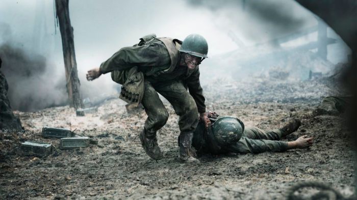 Desmond Doss (Andrew Garfield, imerecidamente indicado como melhor ator) começa sua carreira no Exército sendo espezinhado, linchado e chamado de covarde. Termina reverenciado como herói depois de passar por experiências crísticas como apanhar e não revidar, sacrificar-se pelos irmãos – e até pelos inimigos – e ascender aos céus simbolicamente na cena do seu próprio resgate. O proselitismo do criacionista Mel Gibson visa transformar a narrativa do herói numa parábola religiosa que possa agradar também ao complexo industrial-militar americano.