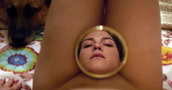 Essa incompletude de Marina é trabalhada em vários níveis. Há a relativa serenidade com que ela encara as reações das pessoas à sua firme convicção sobre o amor do casal. Uma firmeza mantida quase sempre em fogo brando, com poucos momentos de explosão. Por vezes, a serenidade chega a soar como apatia, adensando o enigma em torno da sua forma de estar no mundo. Há também o caráter elusivo do sexo, pois a genitália é sempre ocultada de maneira ostensiva e provocante (como na foto acima). Note-se ainda as visões que ela tem do companheiro morto, indicativo de uma espécie de consciência superior a vigiá-la ou guiá-la em momentos cruciais da recente viuvez.