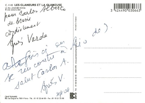 Há muitos anos eu coleciono postais de cinema. Tenho alguns amigos e amigas que me trazem ou enviam postais colhidos em festivais internacionais. Uma delas é a cineasta Vivian Ostrovsky. Certa feita, Vivian me presenteou com um postal de Os Catadores e Eu autografado pela diretora: “para Carlos Alberto do Brasil, cordialmente, Agnès Varda”.