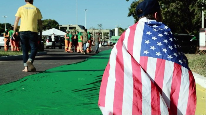 Assim, pessoas favoráveis e contrárias ao afastamento da presidenta aparecem posando para a câmera, caladas e “fantasiadas” com seus adereços, em meio a manifestações. Enquanto isso, vozes desencarnadas em off declamam seus slogans e fazem a apologia de suas respectivas posições. Alguns comentários ultrapassam a superfície do óbvio ou do preconceito e soam mais analíticos ou supostamente ponderados, evidenciando tratar-se de gente culta e estudiosa do assunto. Estes serão apresentados e nomeados nos créditos finais, ao passo que os populares ficarão sem identificação. Uma divisão de classes culturais se coloca aí, separando os “de nome” dos anônimos.