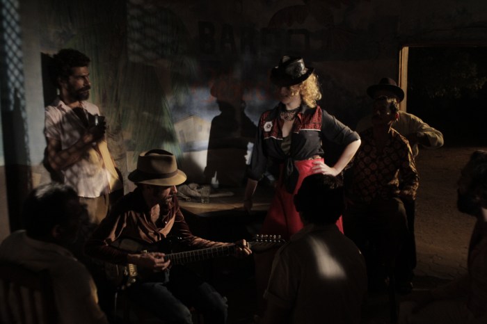 Os diretores Luiz Pretti, Ricardo Pretti e Pedro Diogenes usam uma linguagem flutuante que parte do road movie surrealista, envereda pela encenação brechtiana com direito a cabaré, flerta com a estética de um Edward Hopper do sertão e desemboca, em tela quadrada, num clima onírico meio lynchiano. São referências muito díspares, eu sei, mas foi o que as cenas me sugeriram.