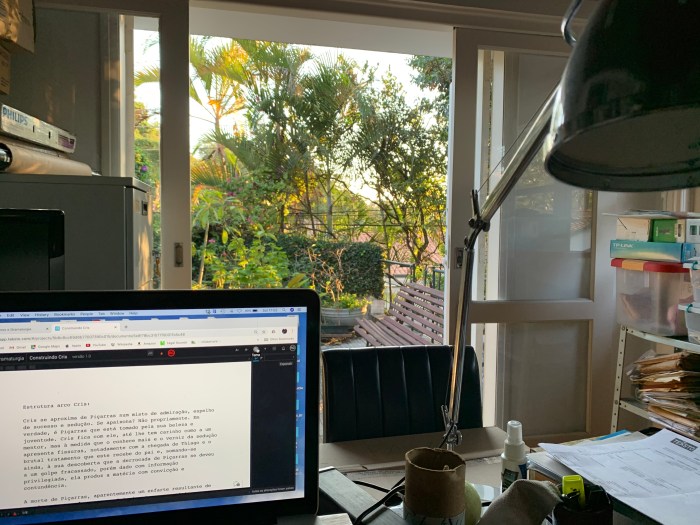 “A paisagem em minha frente durante as horas de trabalho em meu escritório. Depois dos afazeres domésticos e burocráticos aos quais dedico a parte da manhã, minhas tardes acontecem aqui. Penso que minha foto reifica essa paisagem para a qual pouco olho, focado no meu notebook (como somos limitados). É um lugar muito agradável, mas o inferno está dentro de nós”. São Paulo, SP