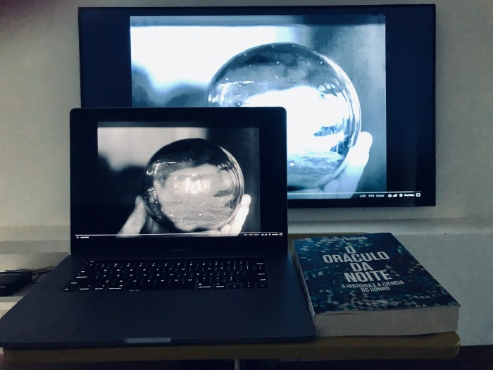 “A foto que estou mandando mostra o interessantíssimo livro recém lançado, O oráculo da noite – A história e a ciência do sonho, de Sidarta Ribeiro, pareado com a projeção de Le tempestaire, de Jean Epstein, que a Cinemathèque Française está disponibilizando online em cópia restaurada. Foi uma dica do meu queridíssimo Carlos Adriano, um filme deslumbrantemente onírico que imagino certamente ser um dos que estavam na cabeça do Robert Eggers quando ele fez o também deslumbrante O farol. Eu escolhi essa imagem porque poucas vezes na vida tive, como nesta quarentena, uma sensação tão forte de que, como disseram de Calderon de la Barca ao sábio chinês, a vida é sonho. Só que desta vez eu estou torcendo para que muito em breve a gente possa dizer que o sonho acabou”. Itu, SP