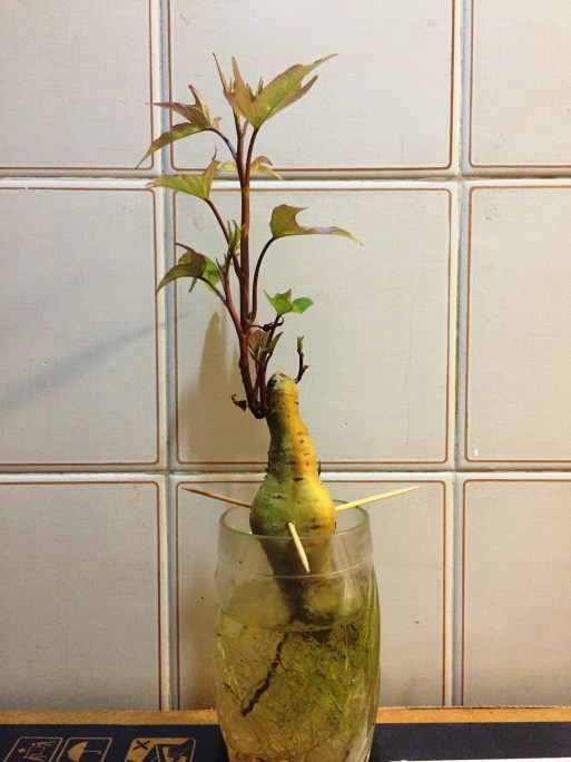 “Plantei na água essa batata orgânica. Veio na cesta que pedi na segunda semana de confinamento. Demorou muito pra formar raiz e mais um tanto pra sair o primeiro broto. Um belo dia brotou. Brotou e segue crescendo com toda força. Adoro ver a vida colorindo em novas folhas verdes e roxas”. Rio de Janeiro, RJ