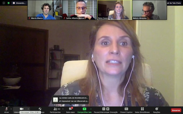 Em média, 150 pessoas assistiram a cada um dos encontros, tendo alguns ultrapassado a barreira dos 200 participantes. À medida que ganhávamos segurança no uso da plataforma (Zoom integrado à Sympla Streaming), fomos abrindo o campo para uma maior interatividade. Já a partir do segundo encontro, liberamos todas as câmeras e microfones para uma conversa coletiva ao final da palestra. O que apelidamos de “papo de boteco” foi se tornando um momento esperado por todos, quando as questões abordadas se estendiam em meio a trocas afetivas, muito humor e uma forma de convivência que se aproximava muito do presencial, como bem registrou o artista e curador Batman Zavareze, um dos maiores entusiastas dessa “experiência”.