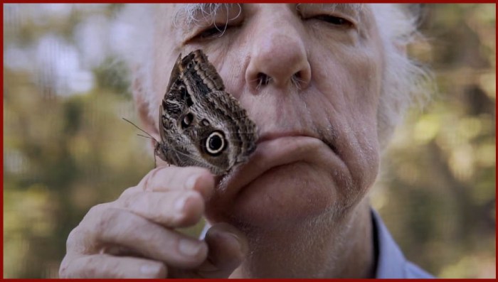 A borboleta pousada junto ao rosto de Ângelo Machado é uma das várias carícias cinematográficas que sua neta, Mariana Machado, lhe fez no média-metragem ÂNGELO, em cartaz na Mostra Ecofalante (veja aqui, mediante cadastro no site da mostra). O simpático e bem-humorado senhor, falecido em abril último, foi um emérito ambientalista e zoólogo, estudioso de borboletas e libélulas, além de professor e autor de peças e livros infantis. Ele mesmo brinca com sua multiplicidade enquanto performa para a câmera de Mariana na casa onde viveu por 50 anos, em Minas Gerais.