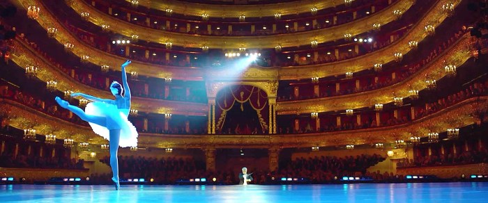 A estrutura narrativa salta entre presente e passado, criando elipses nem sempre bem explicadas. Emoções e decisões das personagens às vezes parecem fora de propósito por não estarem baseadas em ações claras. O que sustenta o interesse do filme por pouco mais de duas horas é o rigor formal e a imponência dos cenários autênticos do Bolshoi e da Academia de Dança de Moscou, filmados com lentes ultrapanorâmicas ((não esqueçamos que “bolshoy” significa “grande” em russo). O elenco composto de excelentes bailarinos jovens é um espetáculo à parte nos ensaios e apresentações, o que justifica a atenção dos fãs do balé clássico. No papel de Yulia jovem está Ekaterina Samuilina, da equipe olímpica russa de ginástica rítmica. As cenas de dança com ela desafiam os cânones da ortopedia.