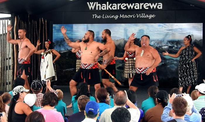 A aldeia Whakarewarewa é um dos pontos onde o turismo se mistura à vida comum de uma comunidade maori. Depois de caminhar pelas ruas tranquilas e ver os poços fumegantes que o povo usa até para cozinhar, somos brindados com uma sessão de cantos e danças maori. Os performers entoam seus brados de guerra e mimetizam as entidades guerreiras em suas poses e expressões de desafio.