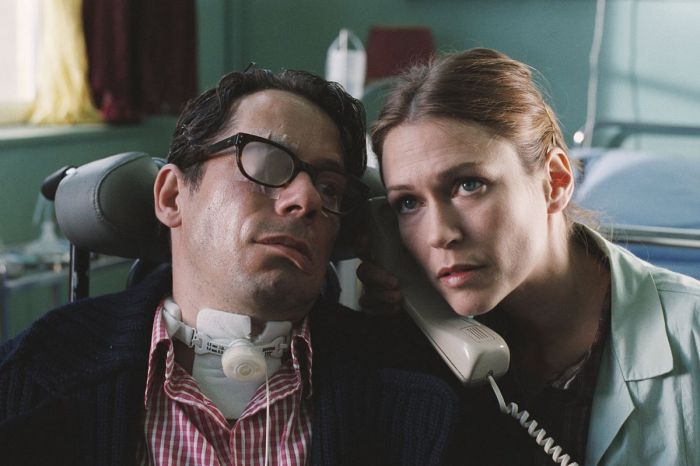 Quando o filme começa, Bauby está voltando a si de um coma de 20 dias. O espectador é deixado no seu ponto de vista, do leito do hospital, pelos 20 minutos seguintes aproximadamente. É um ato de coragem do diretor Julian Schnabel e do roteirista Ronald Harwood – e também uma senha do que virá. Na maior parte do tempo, estaremos confinados ao ângulo subjetivo do jornalista subitamente paralisado pela síndrome do enclausuramento (locked-in syndrom). Bauby só pode mexer o olho esquerdo – e com ele vai se comunicar e “ditar” o livro.