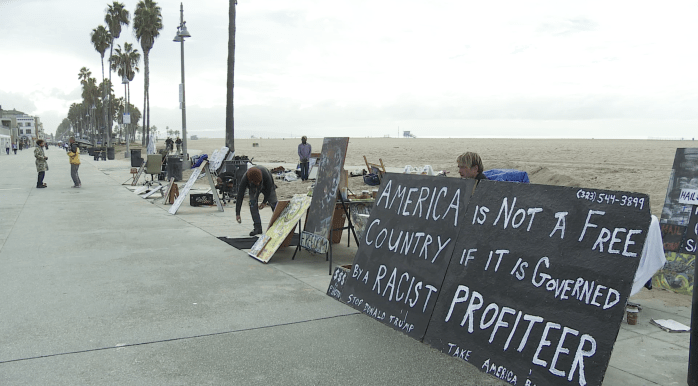 É quando eles acordam de seus portais, estacionamentos, barracas, e são instados pela polícia a se moverem em direção à areia. Esta é a regra local para manter os indesejáveis à distância. Alguns vendem suas (pretensas?) obras de arte no calçadão, outros apenas passam o tempo por ali. São os excluídos da “América”. No outono de 2016, quando Marion os filmou, aproximava-se a eleição de Donald Trump, o que dá margem a comentários de teor diverso.