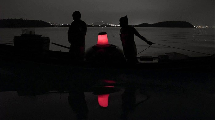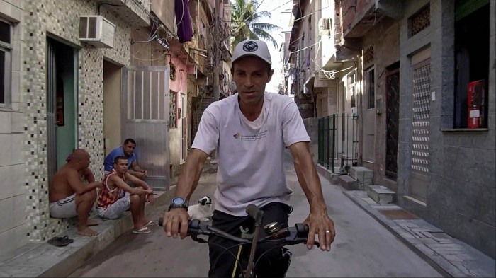 A montagem de Eva Randolph condensa longos períodos de observação em micronarrativas cativantes, que tornam cada módulo uma experiência consistente de entendimento e imersão. Para além da individualidade dos personagens em sua relação de coexistência e sobrevivência com a baía, o filme agencia alguns deles para nos propiciarem lampejos de suas respectivas comunidades. É o caso do passeio de bicicleta do operário pelas ruelas do Complexo da Maré e a amável convivialidade de um bairro quilombola em São Gonçalo. Mais uma vez se instala o dispositivo do “olho visitante” que aponto no meu texto sobre os documentários de Murilo Salles.