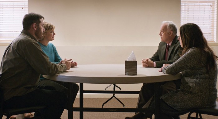 Estreando na criação e direção, o ator Fran Kranz adotou uma escritura “teatral” espessa, inteiramente dependente da excelência dos atores. Martha Plimpton, Jason Isaacs, Ann Dowd e Reed Birney se esmeram no delineamento do turbilhão de emoções que perpassa aqueles corpos e fisionomias. São interpretações muito distintas entre si, mas igualmente permeadas pela manifestação de uma dor profunda, de culpas e desculpas, de sentimentos conflituosos oscilando em cada consciência. A impressão que tive foi a de presenciar pessoas em lugar de ver personagens.