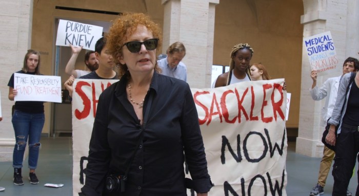 Os protestos do grupo no interior ou à frente de museus como o Metropolitan e o Guggenheim, em Nova York, e o Louvre de Paris reivindicavam que as instituições parassem de aceitar as doações milionárias com que os Sackler procuravam limpar sua reputação e retirassem o nome da família da alas batizadas em troca da filantropia. O filme traz registros dessas performances, nas quais Nan investia sua fama e a própria circunstância de ter suas obras nas respectivas coleções.