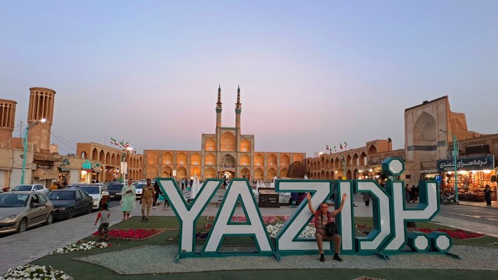 O passeio por Yazd é refrescado por inúmeros terraços, onde se encontram cafés, restaurantes e lojinhas de tudo o que possa interessar ao turista. Dali se descortina o panorama ocre da cidade com suas cúpulas e torres de vento – um visual que combina muito bem com um bom suco de romã ou uma shisha (fumo em narguilé).
