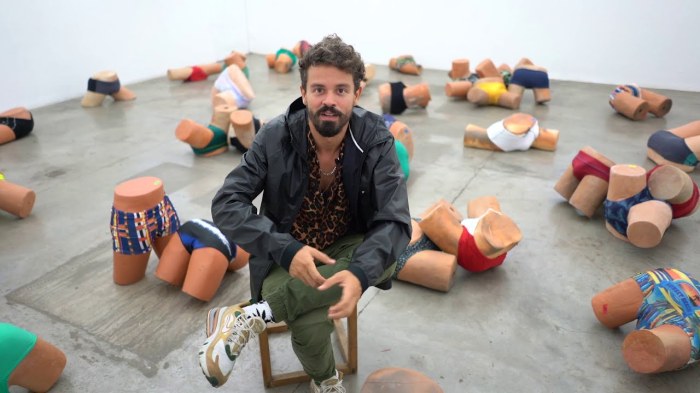 Quem assinava a representação brasileira era Jonathas de Andrade, alagoano formado e residente em Recife, que hoje é um dos artistas brasileiros mais celebrados nacional e internacionalmente. Seus trabalhos já foram expostos em quatro continentes, incluindo individuais nos museus de arte contemporânea de Chicago, Montreal e Lisboa, além do New Museum de Nova York. Aos 41 anos, é um exemplo de precocidade artística. “O trabalho dele, muito cedo, já alcançou uma maturidade temática, política e de linguagem, com muitas camadas, que conseguem apresentar discursos, contradiscursos e ambiguidades da identidade brasileira de forma muito própria”, avaliou Ana Maria Maia, curadora-chefe da Pinacoteca de São Paulo. Por ali passou uma retrospectiva panorâmica de seu trabalho no ano passado. Veja um vídeo sobre essa exposição.
