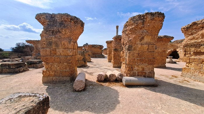 Seguindo mais adiante, através de bairros aprazíveis erguidos sobre ruínas fenícias e romanas, chegamos às majestosas ruínas das Termas de Antonino, mandadas construir pelo imperador romano Antonino Pio. São as maiores termas romanas remanescentes fora da Itália. No extenso conjunto de vestígios, é fascinante circular entre os pilares, colunas e arcadas que ainda restaram sob o sol.