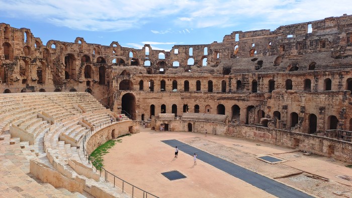 Impressionam as dimensões e a beleza do conjunto, inteiramente construído com blocos de pedra, sem fundações, no século III. Levantá-lo ali, em plena planície tunisiana, para espetáculos populares, foi uma das maiores iniciativas de propaganda da Roma imperial no continente africano. Embora cercado atualmente por construções comerciais, o coliseu de El Jem mantém-se digno do título de Patrimônio Mundial da Unesco.