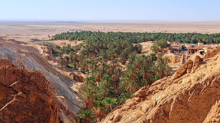Dois outros oásis estavam no meu caminho. Chebika se aninha num vão das Montanhas Atlas, quebrando a monotonia ocre da serra com o esplendor verde de seu palmeiral e as correntes de água. Tamerza, mais árida, exibe uma pequena cachoeira rolando de um grande canyon. Em ambos os oásis, podemos ver a antiga aldeia, abandonada com o passar do tempo, e o novo vilarejo onde a vida continua.