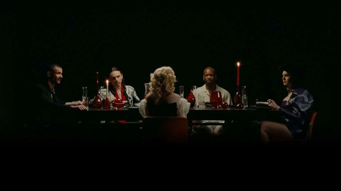 O modelo indisfarçado é o Teorema, de Pasolini, mas você vai encontrar também ecos de Salò, O Discreto Charme da Burguesia e até – vejam só! – do Macunaíma de Joaquim Pedro de Andrade. O visitante é um imigrante africano (Bishop Black) que aparece dentro de uma mala no Rio Tâmisa enquanto uma voz fora de quadro dispara um discurso anti-imigração que bem poderia ter saído da cloaca bucal de Donald Trump (na verdade, é de um político britânico em 1968). Outras malas surgem em Londres com negros semelhantes, mas Labruce se atém a um dos “visitantes”.