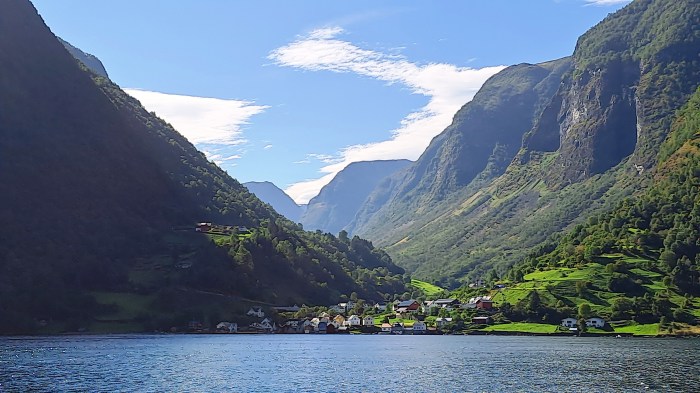 De Balestrand fiz um passeio até o sopé da geleira Bøyabreen, no vilarejo de Fjærland. Em seguida, rumei de barco para Flåm no que talvez seja o trajeto marítimo mais bonito de todos. Cachoeiras e vilarejos graciosos se multiplicam pelas margens do Aurlandsfjord, com seus impressionantes paredões verdejantes.
